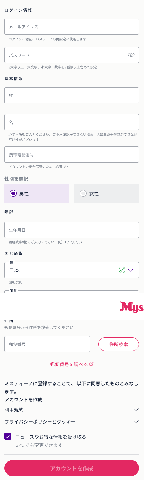 新規登録の際は、公式サイトにアクセスし、メールアドレスや個人情報を入力してアカウントを作成します。登録が完了すると、ミスティーノの1500円の入金不要ボーナスが受け取れます。