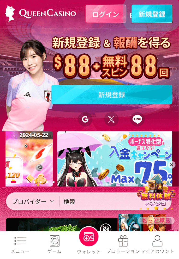 クイーンカジノでは、当サイトより新規登録でボーナス88ドル「日本円で13000円」プラス フリースピン88回もらえます