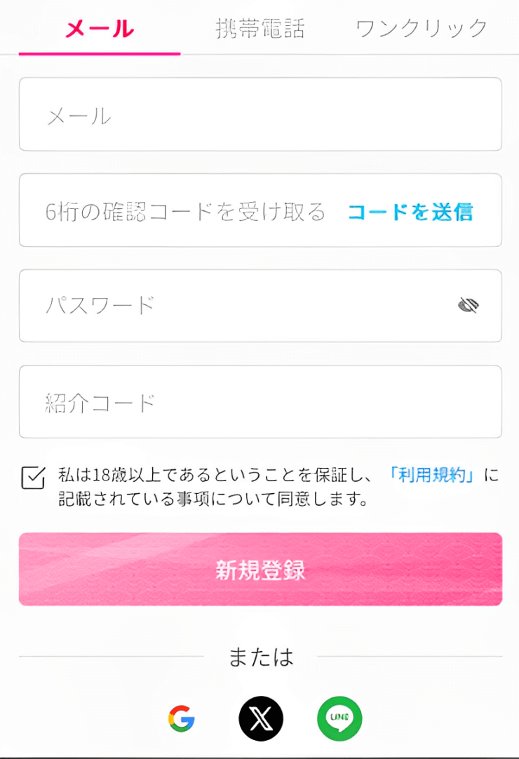 簡単一発登録は画面下に、Googleアカウント LINEアカウント Xアカウントをクリック