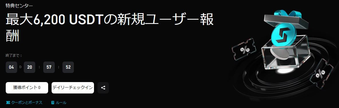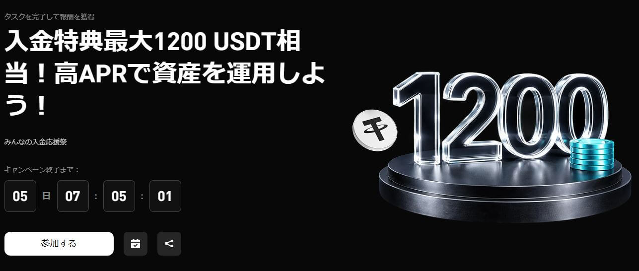 | 追加特典条件 | 1,000 USDT以上の初回投資 + 期間限定Earnタスクの完了 |