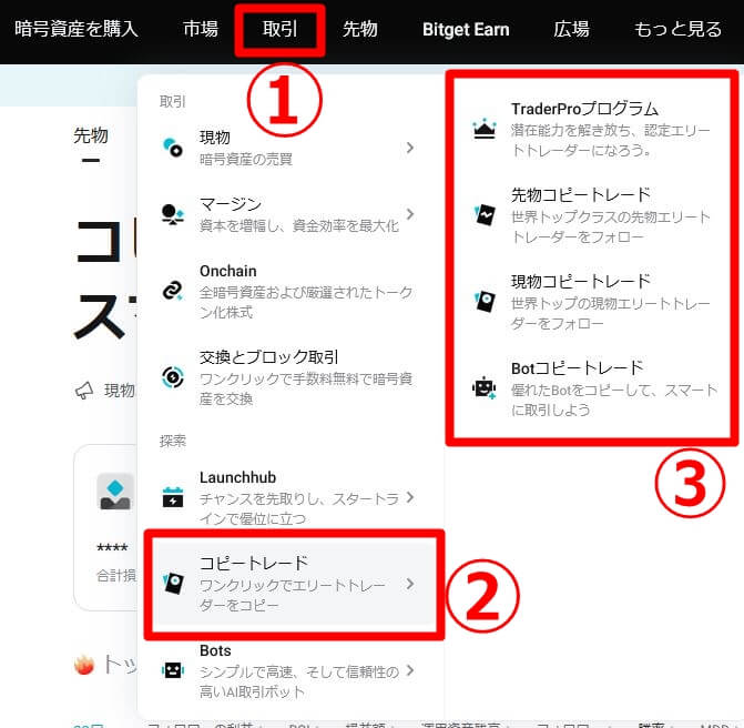 上のツールバー 取引 コピートレード ③で選ぶ