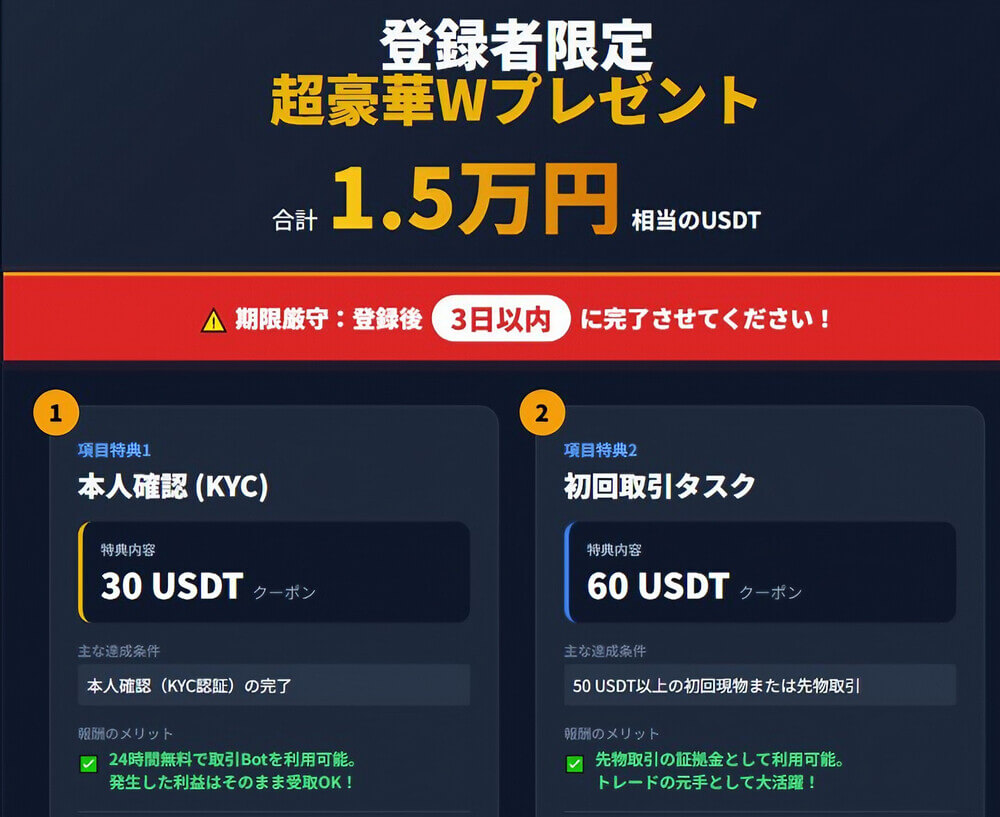 | 特典内容 | 30 USDT 分のクーポン | 60 USDT 分のクーポン |