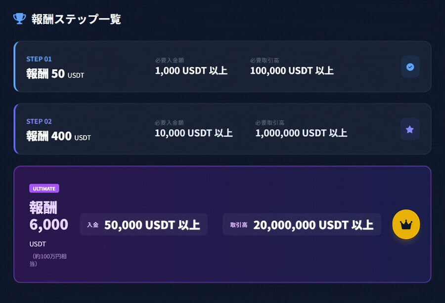 | 主な達成条件 | 本人確認(KYC認証)の完了 | 50 USDT以上の初回現物または先物取引 |