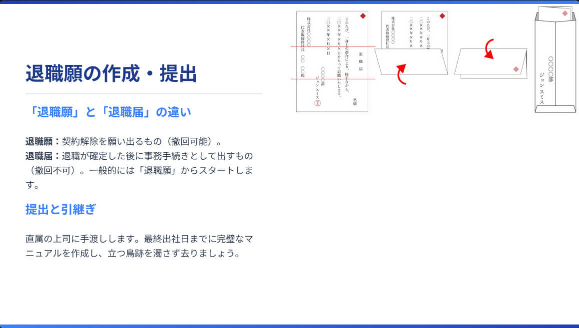 上司のデスクにポンと置くのはNG。必ず手渡ししましょう。「この度はお世話になりました」と両手で差し出すのがマナーです。